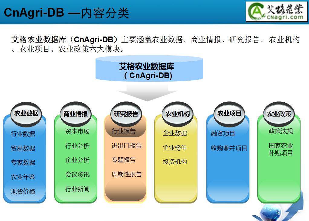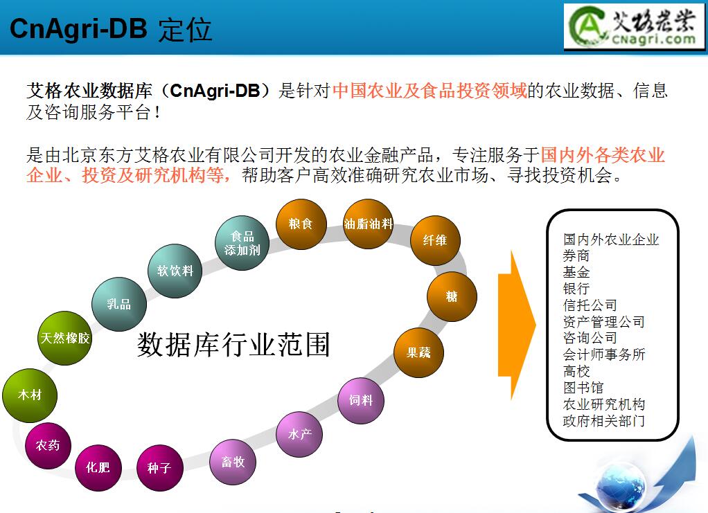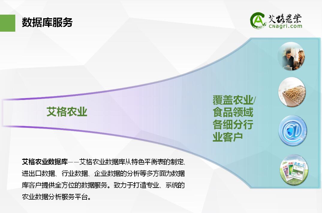 艾格農業(yè)數據庫——艾格農業(yè)數據庫從特色平衡表的制定、進出口數據、行業(yè)數據、企業(yè)數據的分析等多方面為數據庫客戶提供全方位的數據服務。致力于打造專業(yè)、系統(tǒng)的農業(yè)數據分析服務平臺。